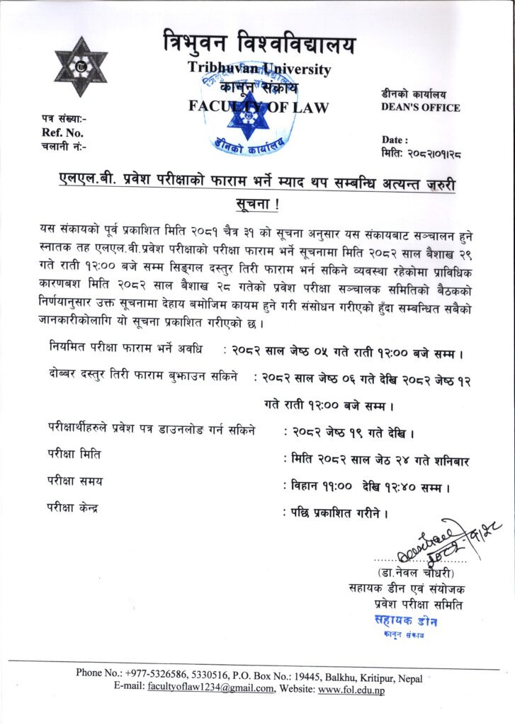 The Office of the Dean, Faculty of Law, Tribhuvan University, announces the LLB Entrance Examination for the 3-Year Bachelor of Laws (LLB) Program for the academic year 2025.